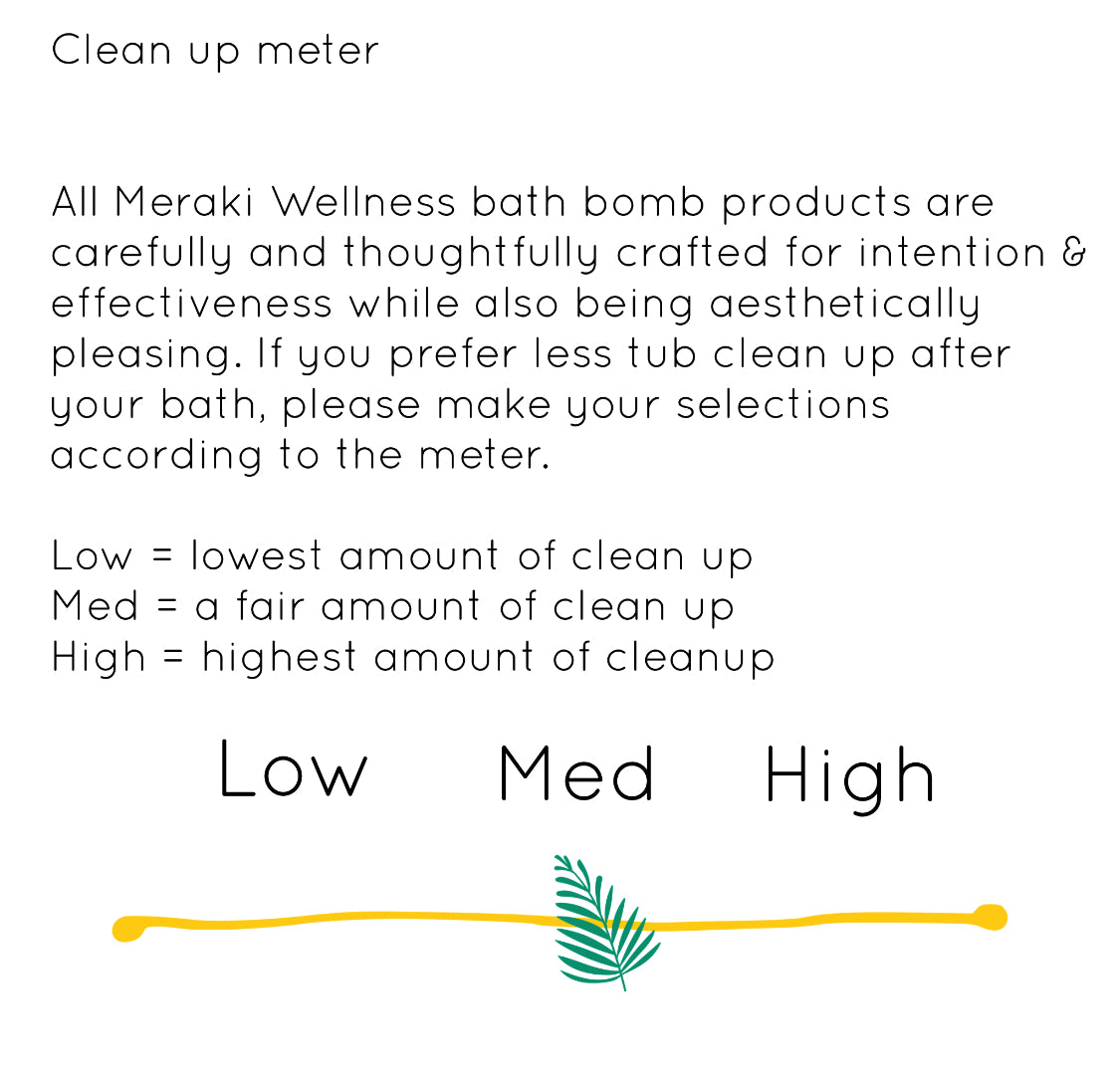 *All Meraki Wellness bath bomb products are carefully and thoughtfully crafted for intention & effectiveness while also being aesthetically pleasing. If you don’t care to clean up the plant matter after use of the bath bombs please add a note at checkout to not add flowers or remove them prior to use. Thank you!